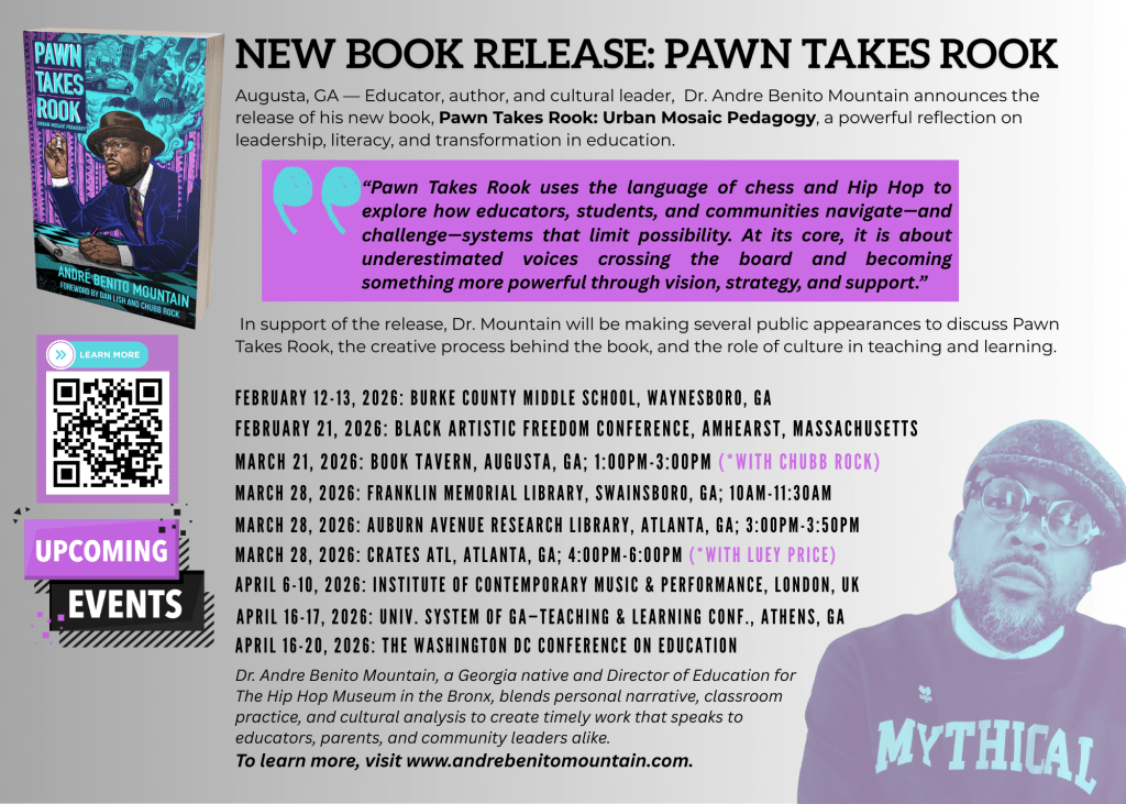 Dr. Andre Benito Mountain is a dynamic voice at the intersection of education, leadership, and Hip Hop culture. As the Director of Education for The Hip Hop Museum—opening Fall 2026—and an adjunct professor in the Education Department at the State University of New York (SUNY) Old Westbury, he brings both scholarly insight and real-world experience to every space he enters. Currently serving in Georgia’s largest school district, Gwinnett County Public Schools, Dr. Mountain keeps one foot grounded in K–12 classrooms, another in higher education, and his mind firmly focused on the future of teaching, learning, and cultural relevance.