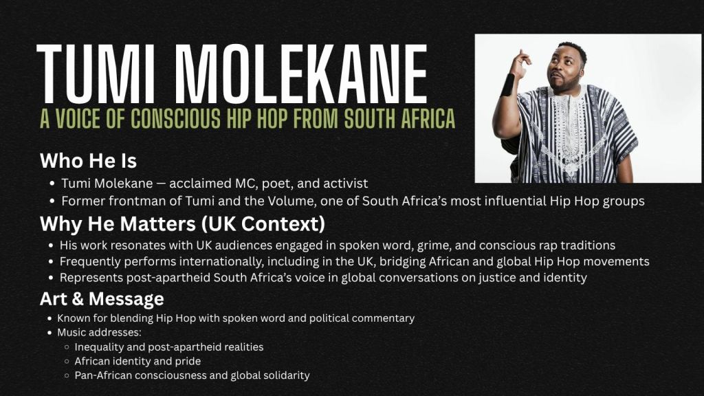 From there, we moved to Tumi Molekane, a South African MC and poet whose work sits at the intersection of African identity and global Hip Hop. We broke down his lyrics—looking closely at how language, aspiration, and resistance show up in his writing.